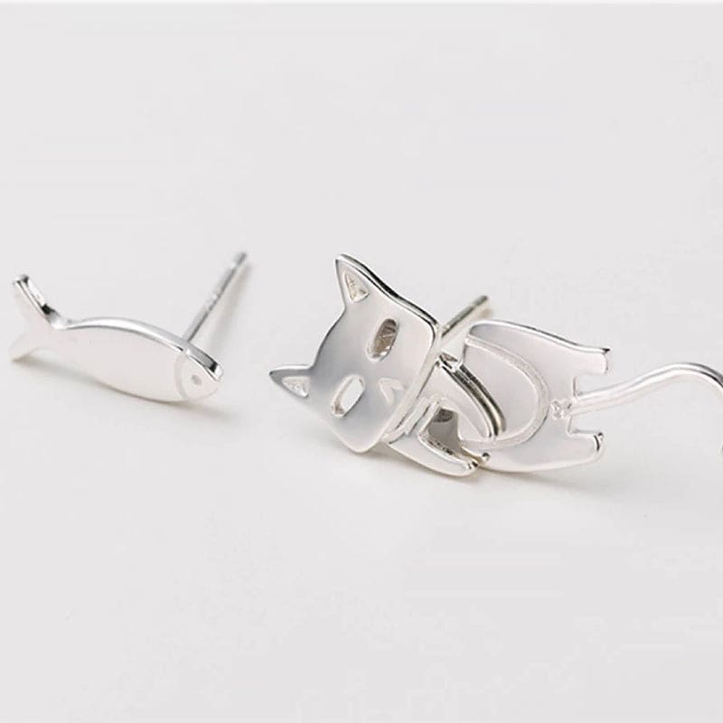 Suspendue à une oreille, la première boucle représente un chat blanc facilement identifiable par ses oreilles pointues et sa queue enroulée. Sur l’autre oreille, vous trouverez son morceau de poisson, une petite attention qu’il appréciera toujours.